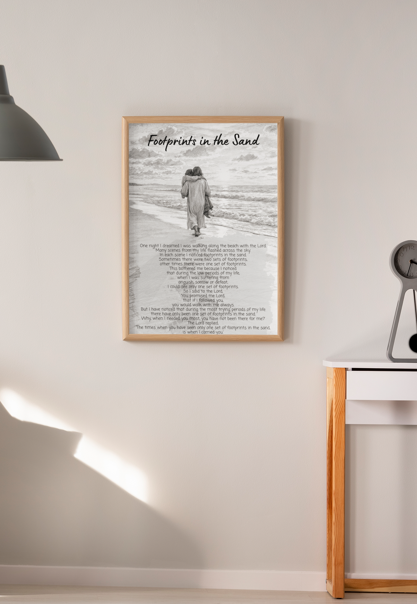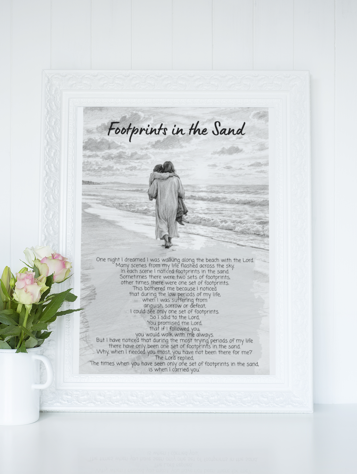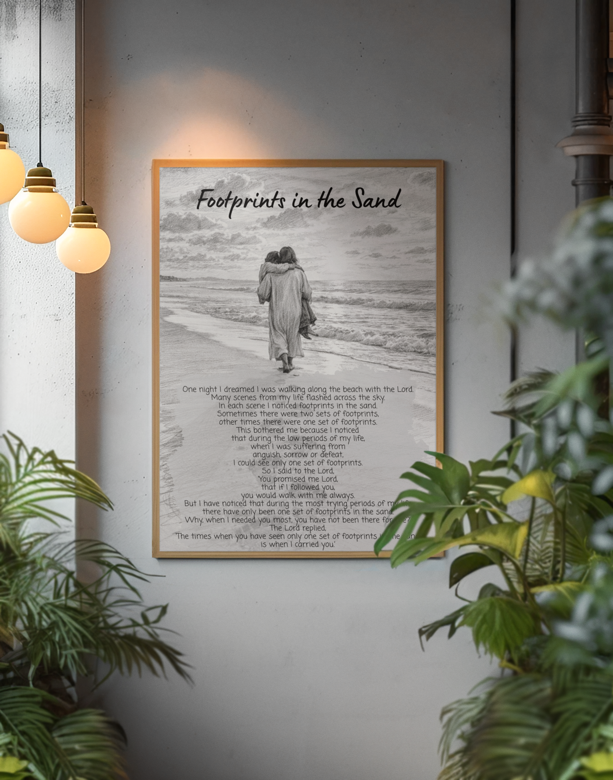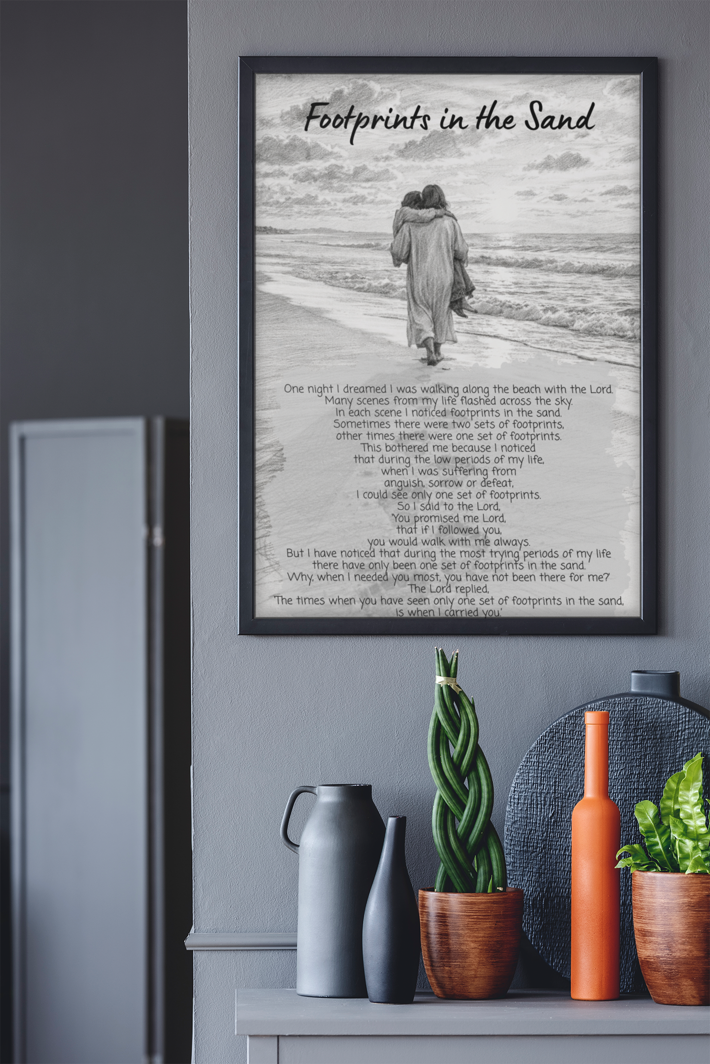Bring comfort, faith, and timeless hope into your space with this beautifully designed Footprints in the Sand matte poster. Featuring a pencil sketch of the sunset over the ocean shoreline with footprints gently trailing along the sand, this piece pairs one of the most beloved Christian poems with serene, contemplative imagery.