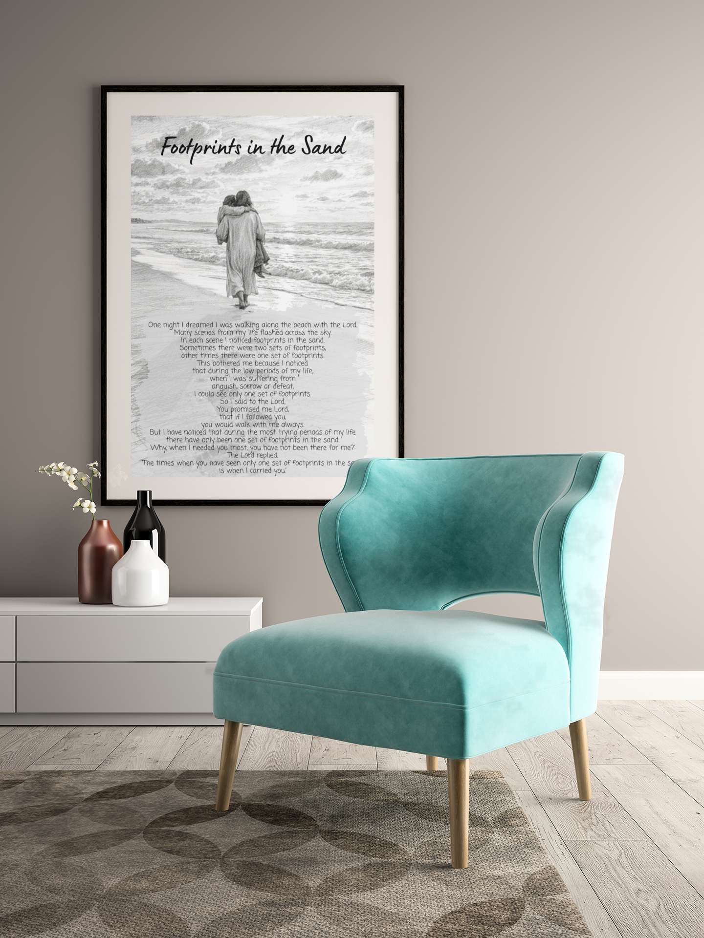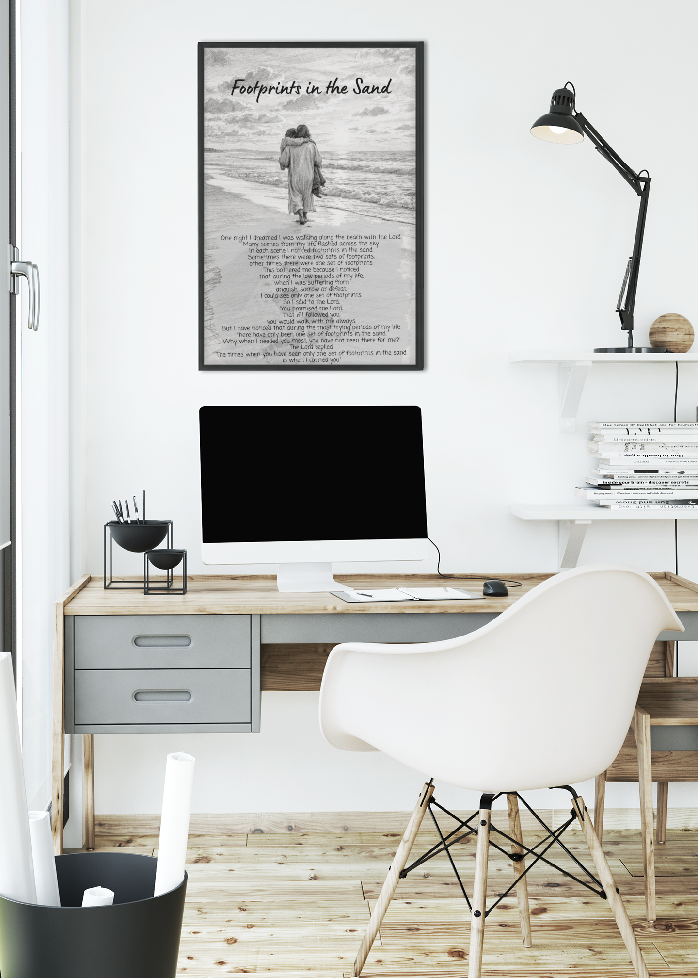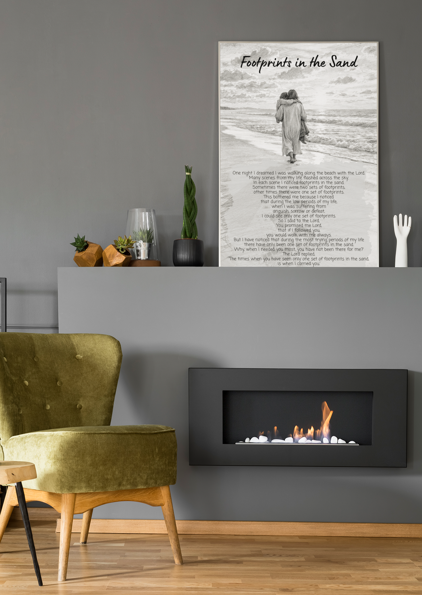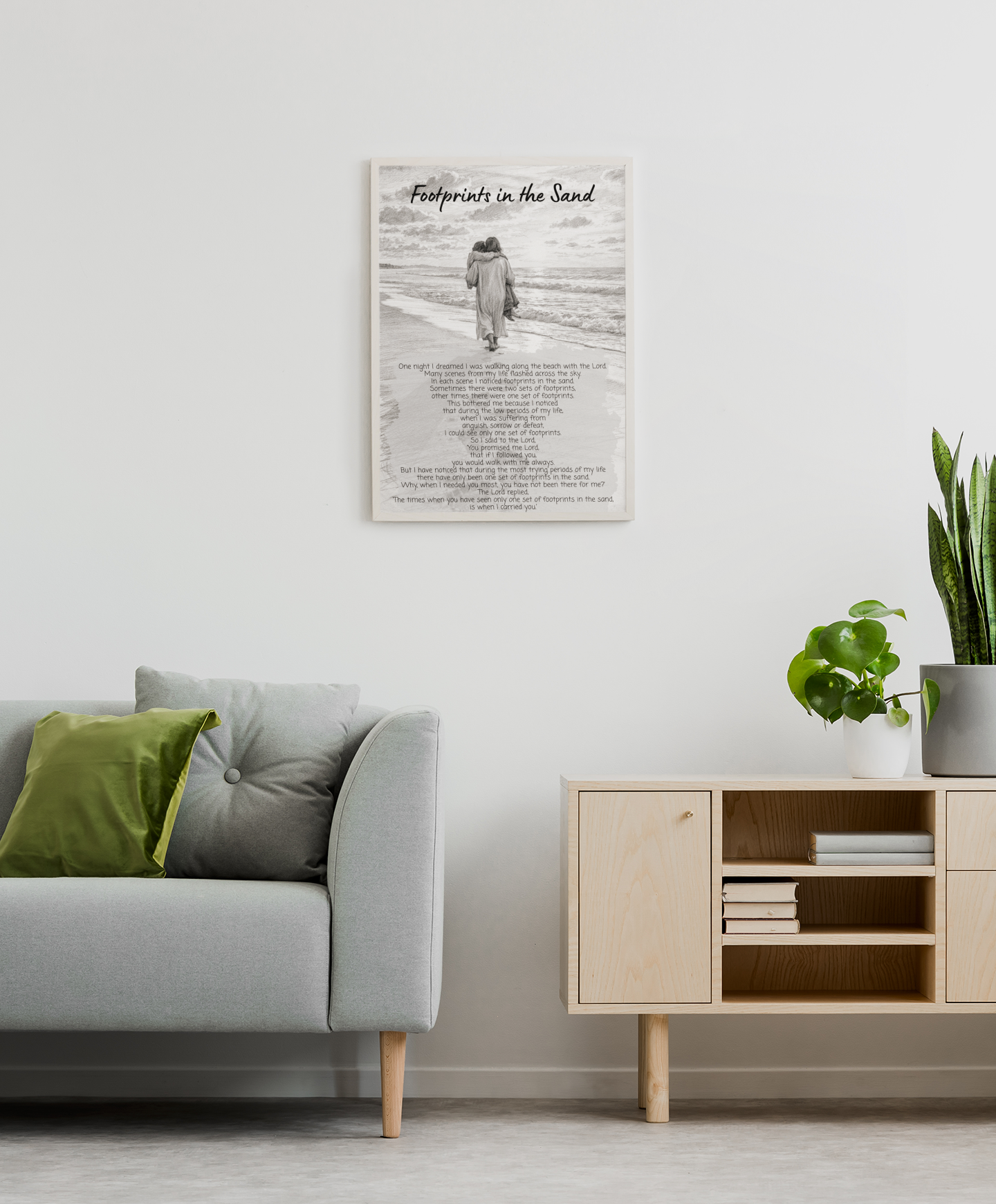 Bring comfort, faith, and timeless hope into your space with this beautifully designed Footprints in the Sand matte poster. Featuring a pencil sketch of the sunset over the ocean shoreline with footprints gently trailing along the sand, this piece pairs one of the most beloved Christian poems with serene, contemplative imagery.